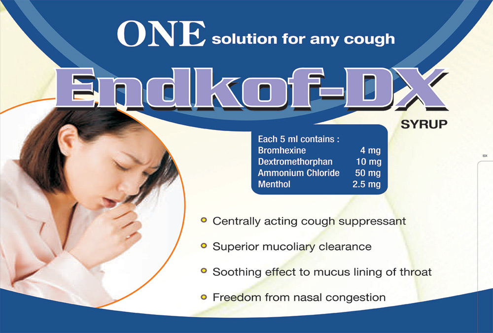 | ENDKOF-AM | Each 5 ml Contains :- Ambroxol HCL IP 15mg Terbutaline Sulphate IP 1.25mg Guaiphenesin IP 50mg Menthol IP 2.5mg |