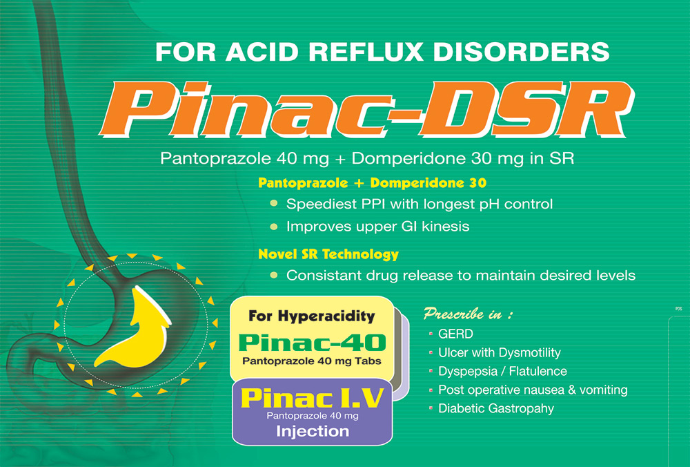 | PINAC – DSR | Pantoprazole 40 mg + Domperidone 30 mg. SR | 10 x 10 T |