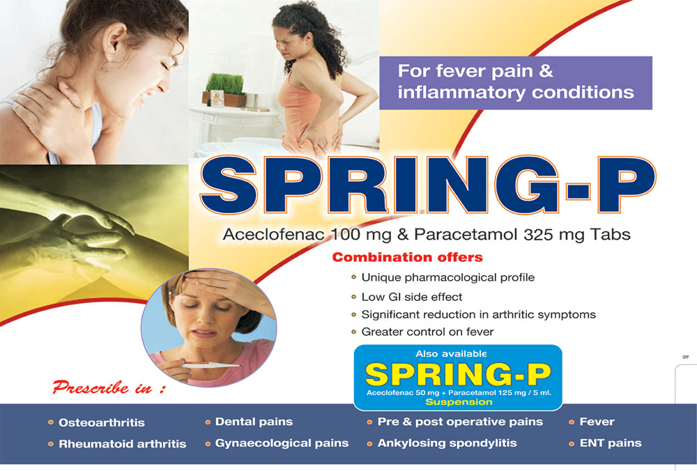 | SPRING – P | Aceclofenac 100 mg + Paracetamole 500 mg | 10 x 10 T |