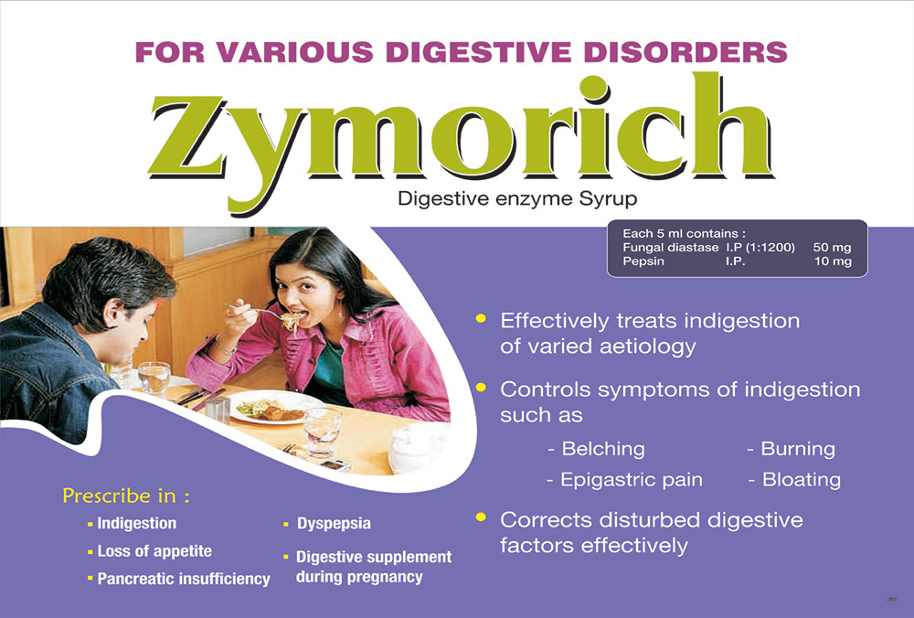 | ZYMORICH SYP | Each 5ml contains Fungal diastase I.P (1:1200) 50 mg (Digests not less than 60 gm of cooked strach) Pepsin I.P (1:3000) 10 mg (Digests not less than 30 gm of coagulated egg albumen) Simethicone I.P 50 mg | 200 ml. |