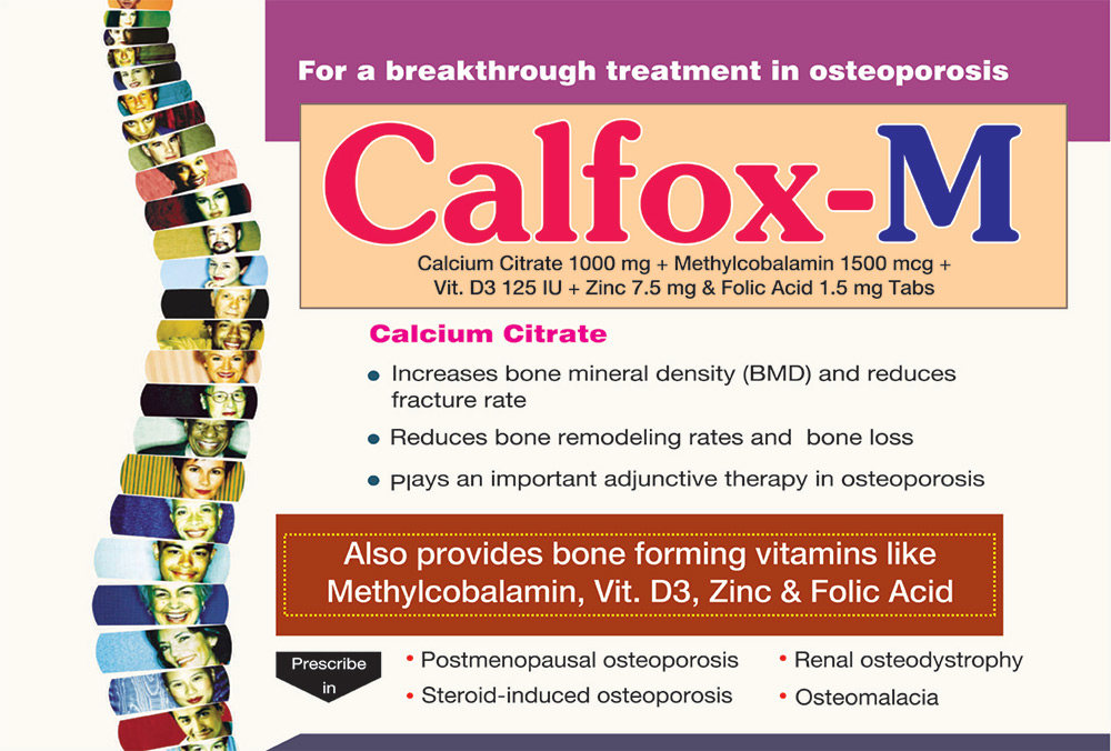 | CALFOX - M | Each film coated tablet Calcium Citrate U.S.P. -1000 mg. + Methylcobalamin J.P.-1500 mcg. + Vitamin D3 I.P.- 125 I.U.+ Folic Acid i.p.- 1.5 mg + Zinc sulphate monohydrate I.P. P Eq.to Elemental zinc 7.5 mg | 10 x 10 T |