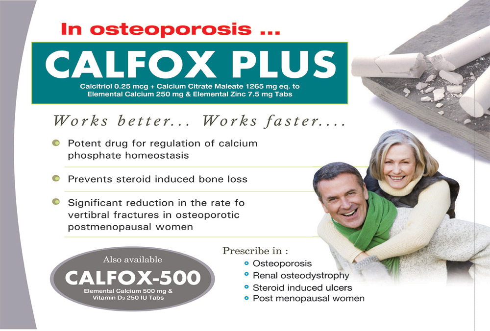 | CALFOX - Plus | Calcitrol B.P 0.25 mcg + Calcium citrate Eq. to Elemental Calcium 250 mg + Zinc sulphate monohydrate U.S.P Eq.to Elemental zinc 7.5 mg | 10 x 10 T |