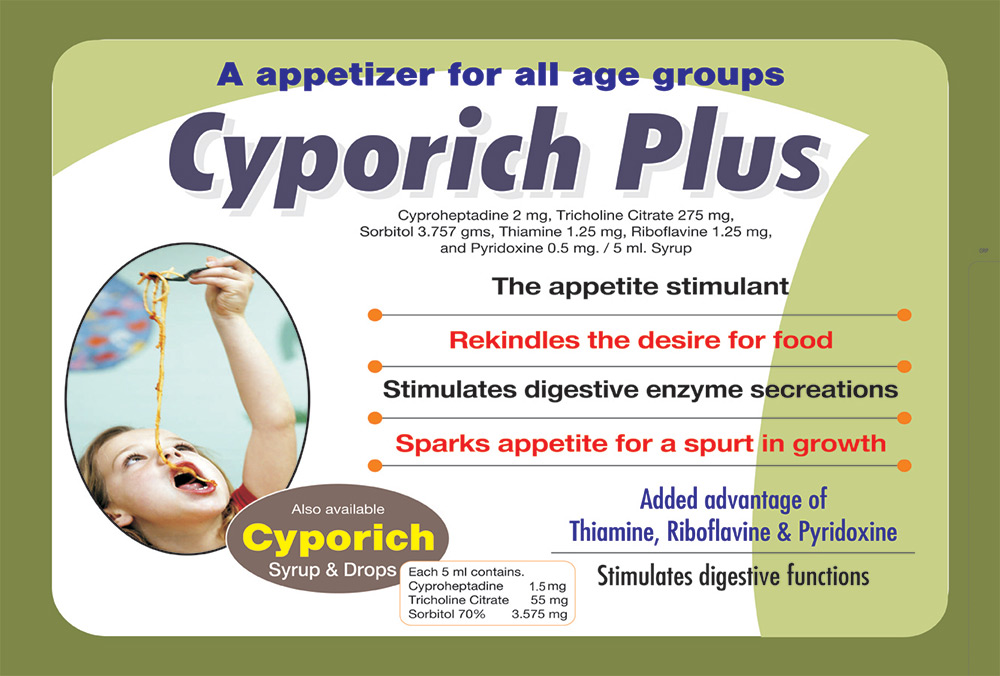 | CYPORICH PLUS Syp. | Each 5 ml Contains:- Cyproheptadine 2 mg. + Tricholine Citrate 275 mg. + Sorbitol Solution (70%) 3.575 gm. + Thiamine 1.25 mg. + Riboflavine 1.25 mg. + Pyridoxine – 0.5 mg | 200 ml |