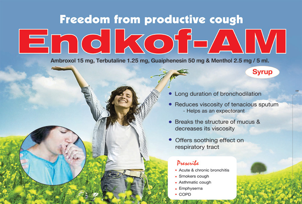 | ENDKOF-AM | Each 5 ml Contains :- Ambroxol HCL IP 15mg Terbutaline Sulphate IP 1.25mg Guaiphenesin IP 50mg Menthol IP 2.5mg |