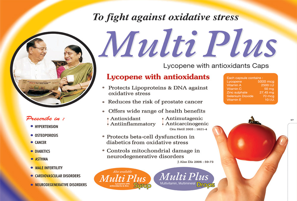 | MULTI PLUS Syp. | Each 10 ml Contains:- Lycopene Red 1000 mcg + Vit, A 2500 I.U + Alpha tocopherol actate 10 I.U + Vit. C 50 mg + Zinc sulphate 3 mg + Selenium Dioxide 35 mcg | 200 ml |