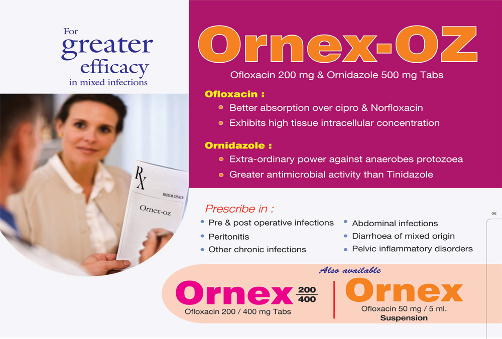 | ORNEX-OZ | Ofloxacin I.P 200 mg Ornidazole 500 mg | 10 x 10 T |