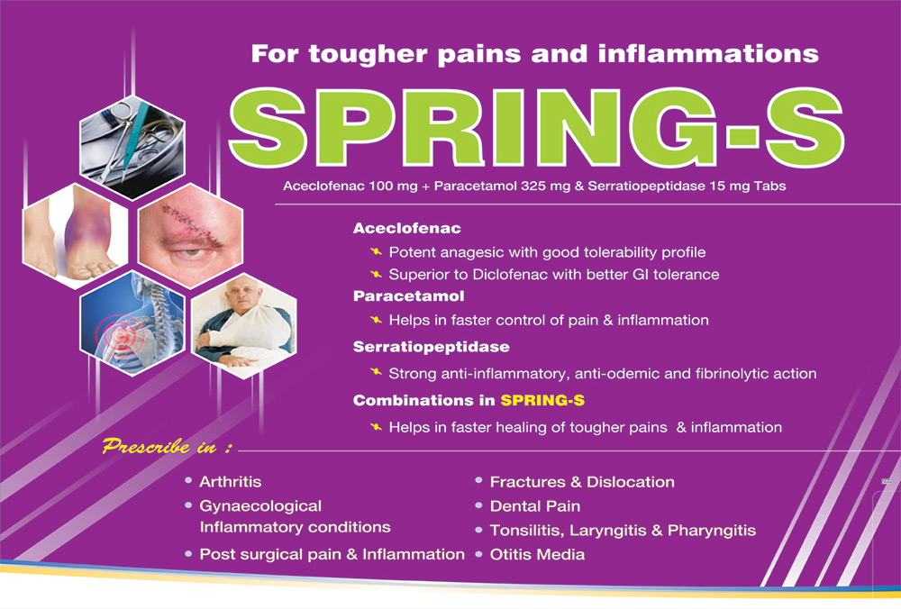 | SPRING – S | Aceclofenac 100 mg + Paracetamole 500 mg + Serratiopeptidase 15 mg | 10 x 10 T |