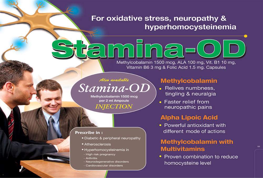 | STAMINA – OD | Methyl cobalamine 1500 mcg. + Alpha lipoic Acid 100 mg + Thiamine Mononitrate 10 mg + Pyridoxine Hydrochloride 3 mg + Folic Acid 1.5 mg Tab. | 10 x 10 C. |