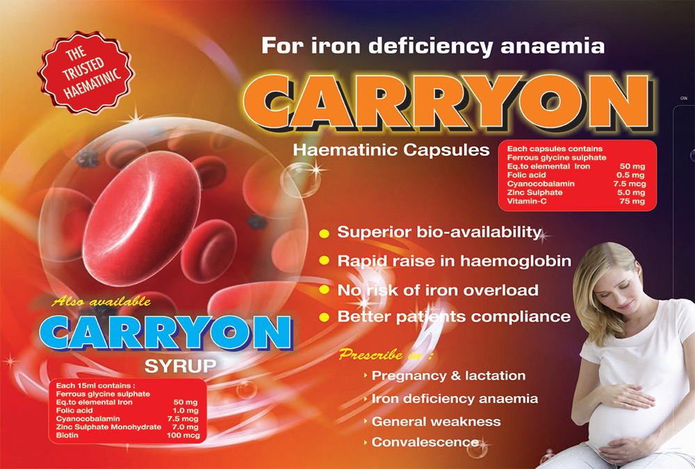 | CARRYON Cap. | Each hard gelatin Capsules contains Ferrous glycine sulphate Eq.to elemental Iron 50 mg + Folic acid 0.5 mg + Cyanocobalamin 7.5 mcg +Zinc Sulphate Eq.to Elemental Zinc 5.0 mg + Vitamin-C ( Coated) 75 mg | 10 X 10 C |