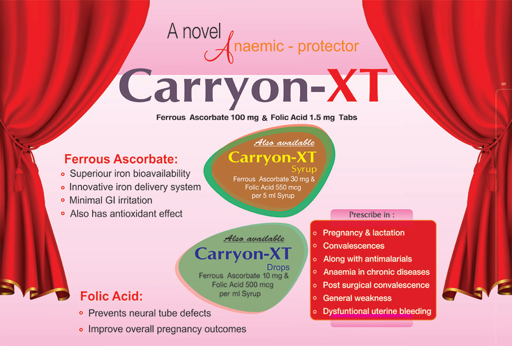 | CARRYON – XT | Ferrous Ascorbate - 100 mg Folic Acid - 1.5 mg Zinc Sulphate - 22.5 mg |